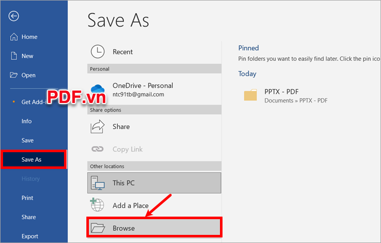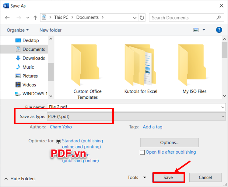 Bước 7: Xuất hiện cửa sổ Save As, bạn chọn đến thư mục lưu file PDF và chọn kiểu Save as type là PDF (*.pdf) và chọn Save.