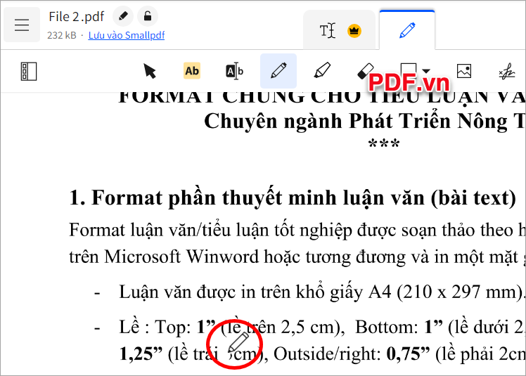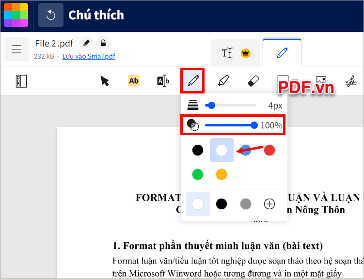 Bước 3: File PDF được hiển thị trên web, bạn dùng bút chì, thiết lập màu bút chì phù hợp với màu nền, độ đậm nhạt 100%.